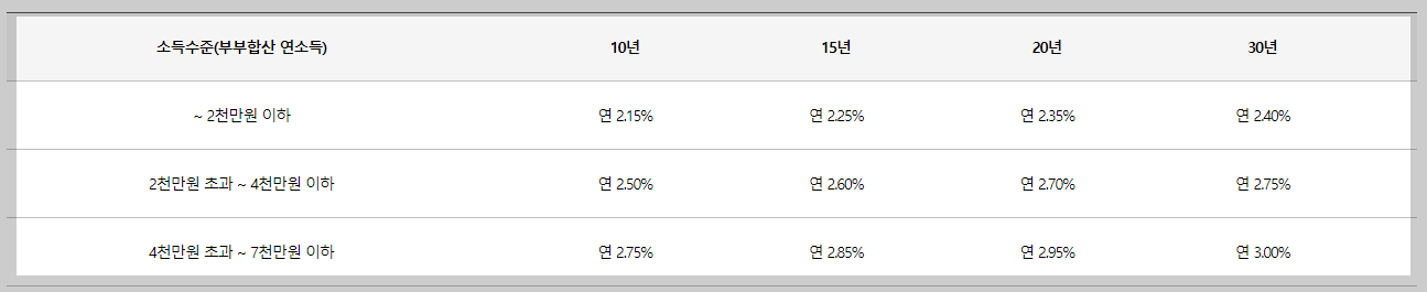 - 대출한도 : 1.5억원(생애최초 주택구입자 2억원) 이하